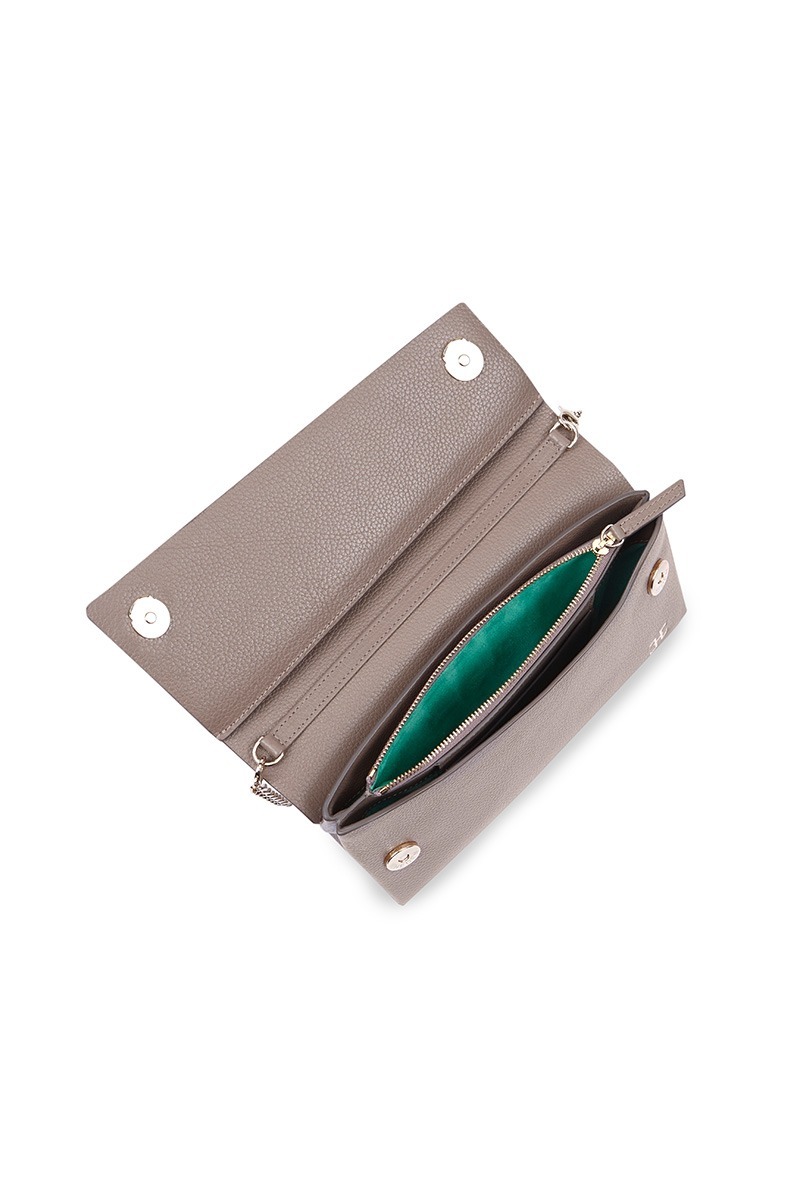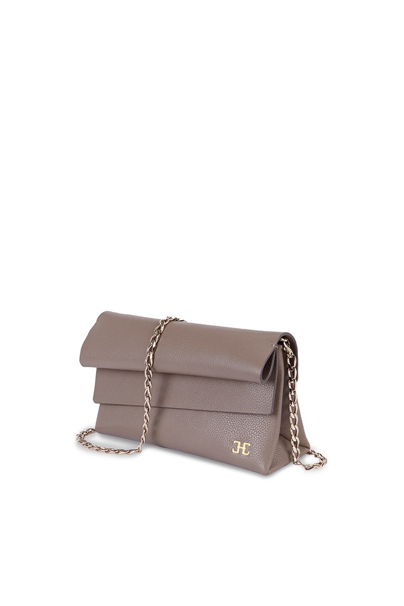 Golden chain. Magnetic closure on the flap. An inner pocket type card holder and zippered pocket. Textile suede lining. Metallic HEDEN anagram. Characteristic stitches sewn by hand. Protective metallic gold rivets at the base.