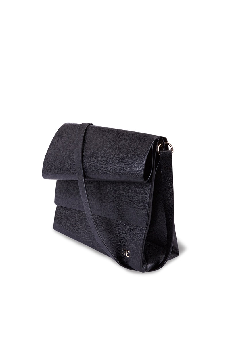 Adjustable shoulder strap. Stitches by hand. Magnetic closure. Three inner pockets, one of them zippered. Textile suede lining. Protective metallic gold rivets at the base. Metallic HEDEN logo.