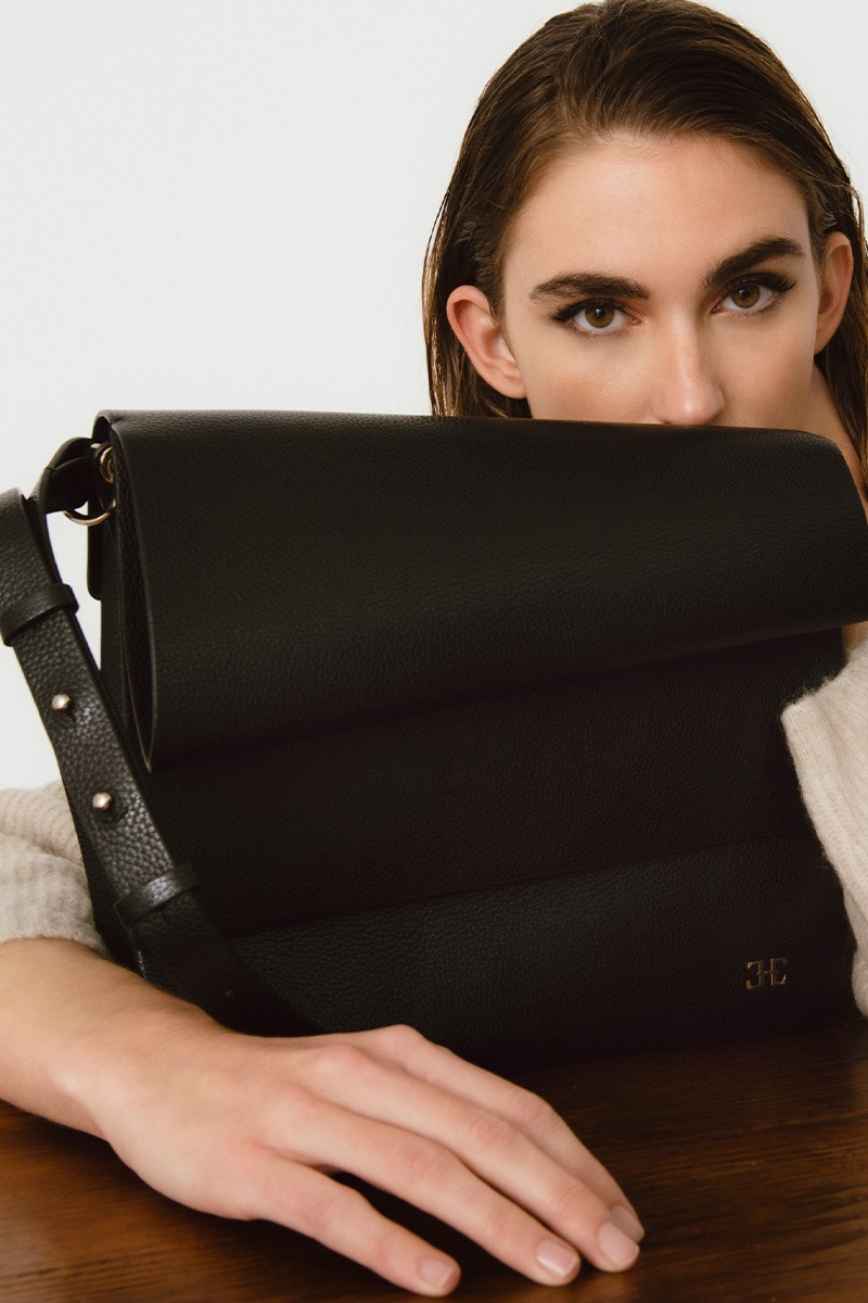 The versatility of the Square model from the Drapé Collection makes it a piece that can be worn during the day or night. The combination of the draped leather on the lapel and its square design makes it unique and recognizable. The prominence of veal leather and its treatment as if it were a textile draping, is a sign of the quality of its manufacture. Lined inside in the characteristic green color HEDEN in textile suede. Sample of the high quality and artisan knowledge of leather work in Spain.